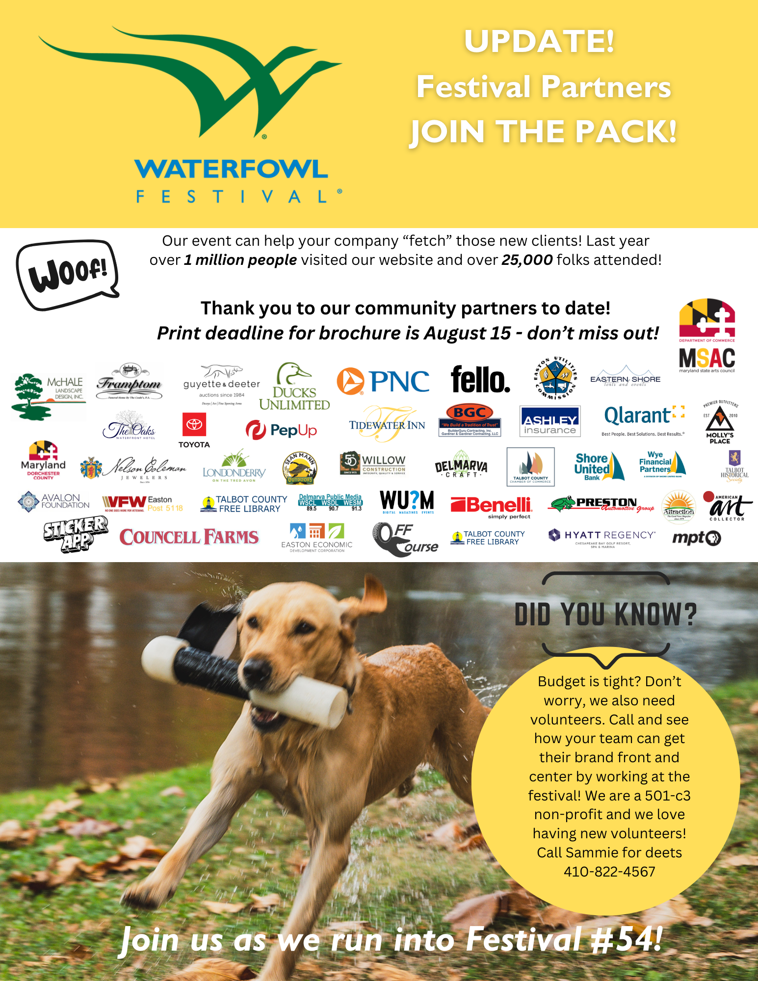 Reach out to the office for more info on Custom & Business sponsorship: Deena Kilmon, Executive Director – 410-822-4567