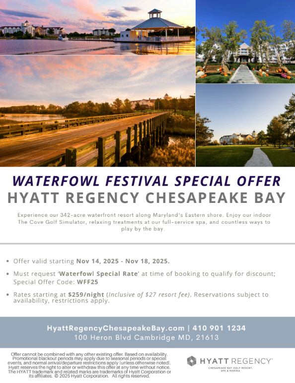 Blue Juniper Inn is an amazing partner for an extended East Coast Visit! They are a great spot to try out on your way down the East Coast either before or after your visit at the Waterfowl Festival. Please call them for special rates and discounts.